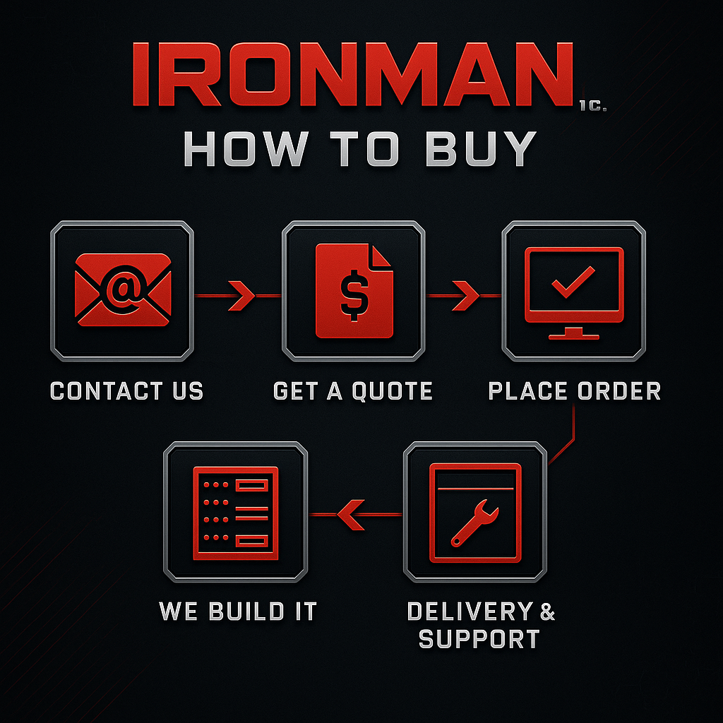 How to Buy How to Buy from IronMAN Inc.IronMAN Inc. makes it easy to purchase high-performance systems, software, and integrated solutions. Whether you're a business, reseller, or government buyer, we offer flexible options and responsive support to guide your order from quote to delivery. Step 1: Tell Us What You NeedStart by reaching out through our contact form, email, or phone. Let us know your application, performance needs, and any specific hardware, software, or service requirements. Step 2: Get a Custom QuoteOur engineering and sales team will review your requirements and provide a detailed quote, including system specs, service options, and lead time. We also offer volume discounts and contract pricing. Step 3: Place Your OrderOnce you're ready, we’ll process your purchase order or provide a secure payment link. We accept major credit cards, ACH/wire transfers, and business checks. Step 4: We Build and DeliverEvery IronMAN Inc. system is built-to-order and fully tested before shipping. You’ll receive tracking info, documentation, and optional pre-configuration or white-glove setup if requested. Need Help?Contact our team any time for product recommendations, technical guidance, or purchasing support. IronMAN Inc. is committed to providing real solutions for real-world demands. Would you like to be an IronMAN Customer or Authorized Partner? Click Here to go to our inquiry page to learn how to become an IronMAN Customer or Partner.
