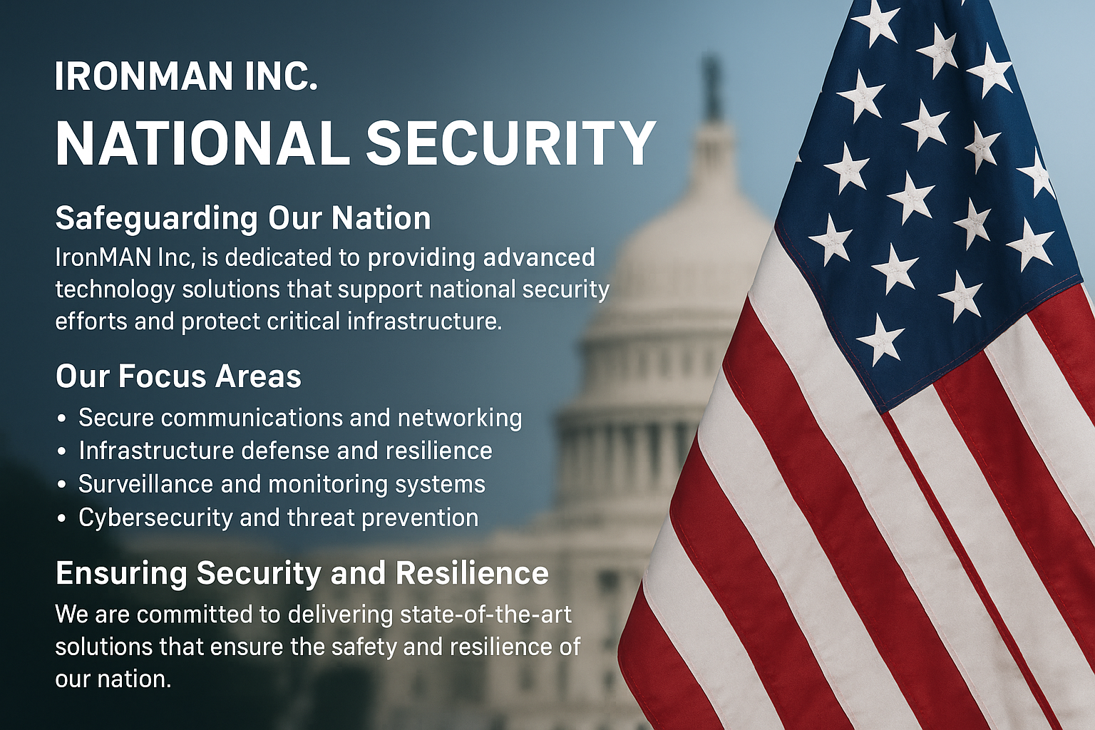 National Security Solutions IronMAN Inc. – National Security SolutionsAt IronMAN Inc., we are committed to providing cutting-edge technology and solutions that safeguard national security. Our suite of security systems is designed to protect critical infrastructure, secure communication networks, and ensure the highest level of safety for both government and private sectors. Why Choose IronMAN for National Security?