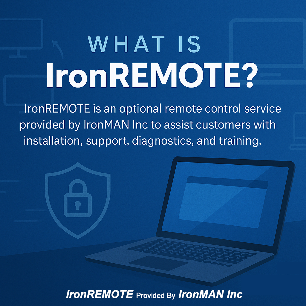 What Is IronREMOTE? What Is IronREMOTE?IronREMOTE is an optional remote control service provided by IronMAN Inc to assist customers with installation, support, diagnostics, and training. It is designed to give IronMAN technicians the ability to securely connect to your system, with your consent, to provide fast and effective help. Whether you’re setting up new hardware, resolving a technical issue, or learning how to use your system more effectively, IronREMOTE allows our support team to work with you directly—no matter where you’re located. IronREMOTE is fully encrypted and only active when initiated by you. Every session is secure, logged, and under your control from beginning to end. Why Use IronREMOTE?